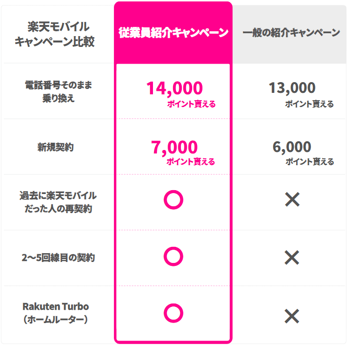 家族に楽天モバイルユーザーがいない場合は「従業員紹介キャンペーン」が最適です。また、紹介されて申し込んだ人が得られる還元は、家族紹介は13,000ポイントに対し、従業員紹介は14,000ポイントと1,000ポイント多いという違いがあります。