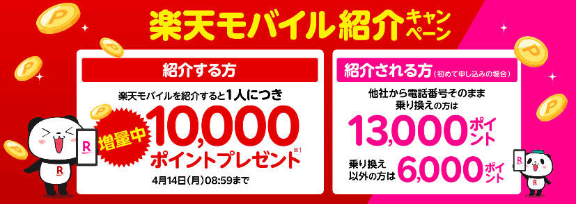 家族に楽天モバイルユーザーがいて「※あなたが過去に楽天モバイル契約歴がない場合」は「家族紹介キャンペーン」がおすすめです。なぜなら紹介した家族も10,000ポイント貰えるから!兄から弟へ紹介した場合兄は10,000ポイントゲット、弟は13,000ポイントゲット(※従業員紹介の14,000ポイントより1,000ポイント下がります。)です。ただ弟は1,000ポイント損はするのでお兄さんから1,000円分何かごちそうしてもらってもいいかもしれませんね(笑)